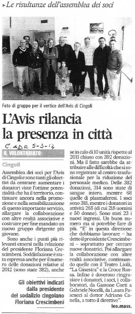 – grazie alla sensibilità di chi mi ha preceduto e che ha provveduto, a suo tempo, ad iscrivere la sezione AVIS di Cingoli al Centro Servizi di volontariato di Macerata, ho potuto partecipare il 23 aprile 2012 all’assemblea provinciale che mi ha permesso di conoscere il ruolo che il Centro Servizi svolge a livello regionale;