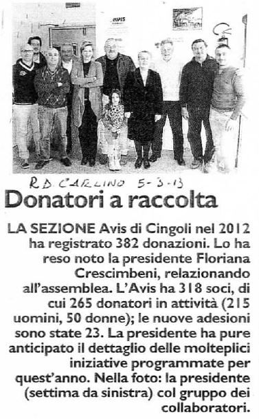LA RELAZIONE MORALE 2012 DEL PRESIDENTE DELL’AVIS CINGOLI FLORIANA CRESCIMBENI, IN OCCASIONE DELL’ASSEMBLEA ANNUALE DEI SOCI di Domenica 3 Marzo (La Polisportiva Victoria è socio “amico” in partnership – sponsorizzazione etica)
