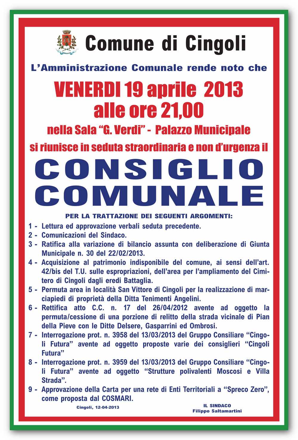 Venerdì prossimo 19 Aprile alle ore 21,00 nella sala G.Verdi del palazzo municipale si riunisce in seduta straordinaria e non d’urgenza il CONSIGLIO COMUNALE per la trattazione degli argomenti elencati nel manifesto sotto.