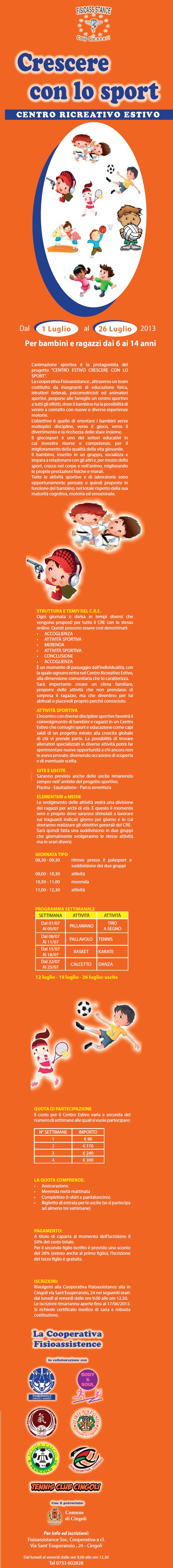 L’animazione sportiva è la protagonista del progetto “CENTRO ESTIVO CRESCERE CON LO SPORT ”. La Cooperativa Fisioassistance , attraverso un team costituito da insegnanti di educazione fisica, istruttori federali, psicomotricisti ed animatori sportivi, propone alle famiglie un centro sportivo a tutti gli effetti, dove il bambino ha la possibilità di venire a contatto con nuove e diverse esperienze motorie.