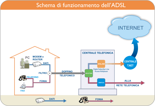 Parlando di Adsl ci si riferisce essenzialmente ad una modalità di connessione digitale fra i nostri computer e la centrale telefonica più vicina alla nostra casa, basata sull’uso del vecchio e tradizionale doppino telefonico. La connettività Adsl finisce nella centrale telefonica alla quale risulta connessa la nostra linea telefonica, e da qui in poi il nostro segnale è trasformato e condotto insieme a quello di molti altri utenti in un flusso di dati destinato a raggiungere il provider internet su linee ad alta velocità.