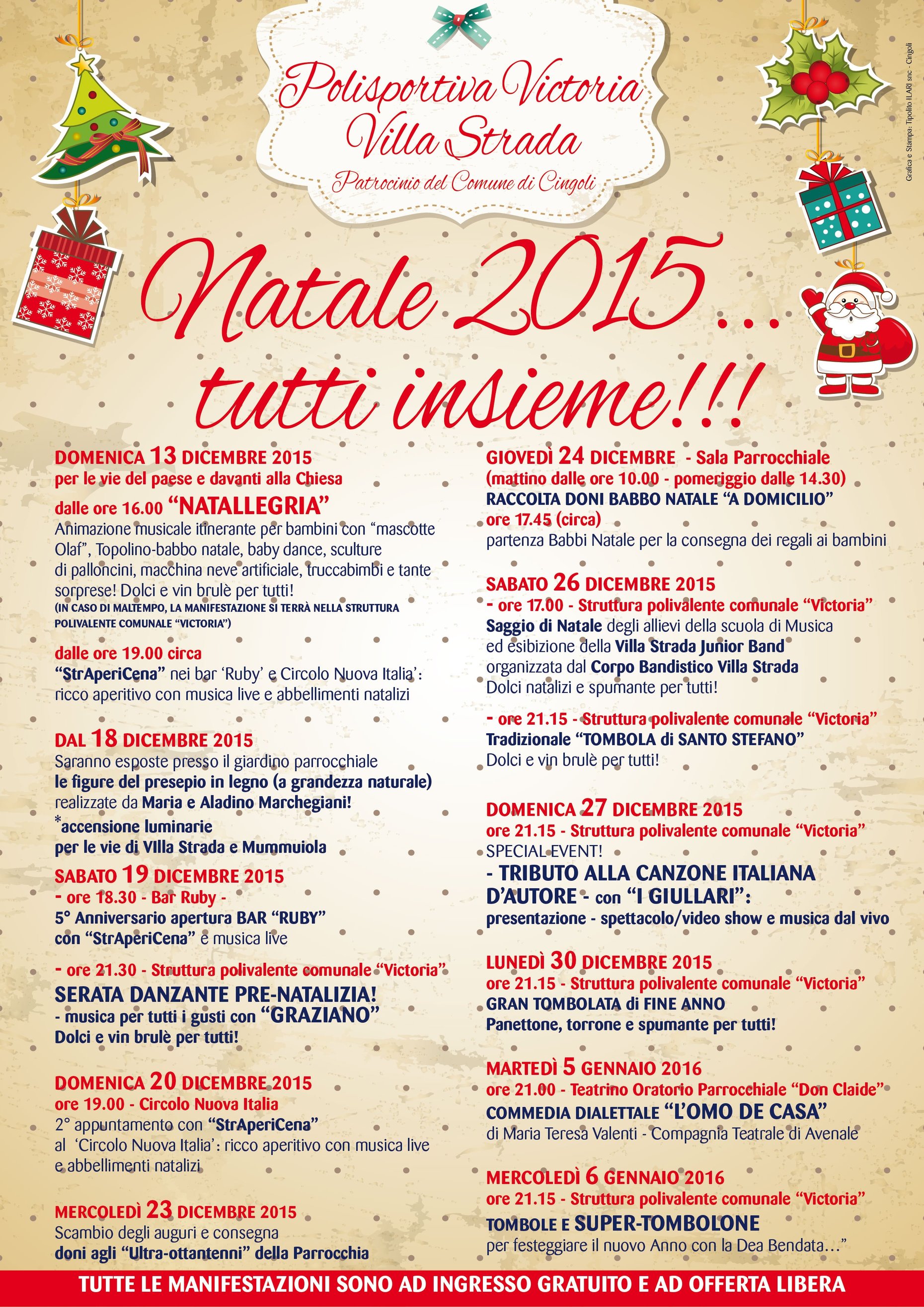 Forti della partecipazione dimostrata dalla popolazione negli anni passati, i ragazzi della polisportiva si sono così messi all’opera per allietare a tutti le festività iniziando proprio da Domenica 13 Dicembre e finire Mercoledì 6 Gennaio con il consueto SUPER TOMBOLONE !!! Ben 11 eventi ed appuntamenti da NON PERDERSI!!!